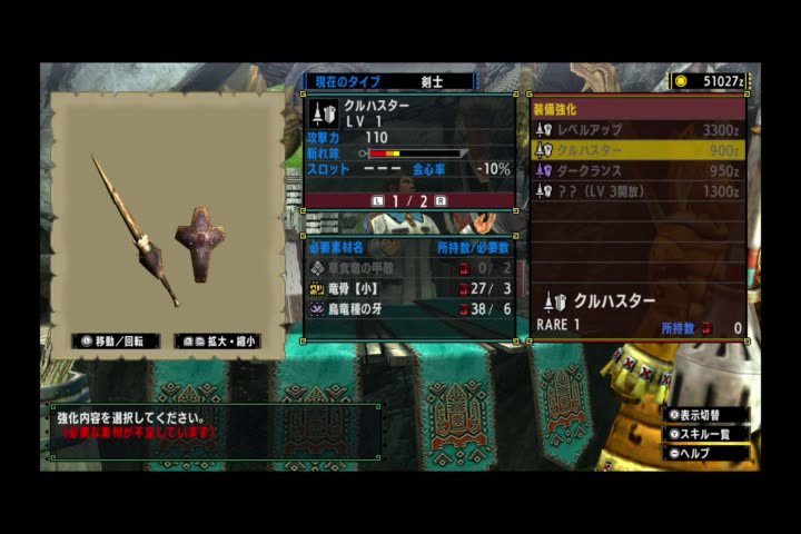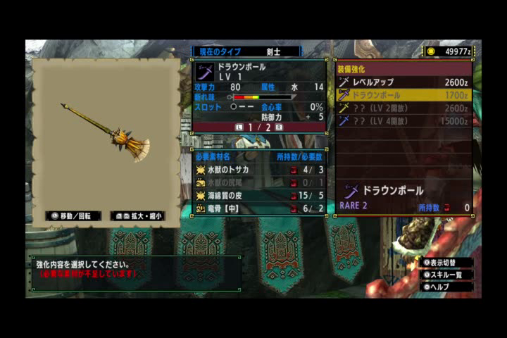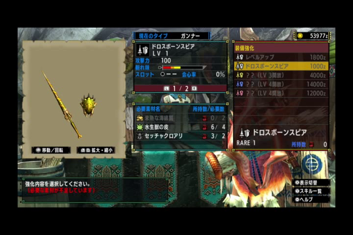 ちなみにドロス槍を作り終わって担いでみたあとに気付きましたが、水属性ランスではないし切れ味黄色と微妙な性能で、突進が弾かれて使いにくいです。