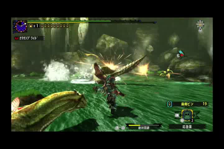 …ただ、闇雲にダメージを稼ぎのに必死になって飛んでいると撃墜されるのと、クック防具なのでドロスの水属性ダメージはかなり重くなります。