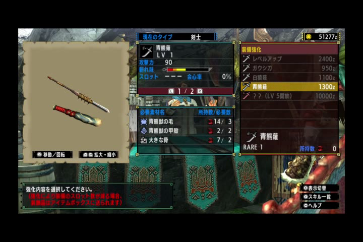 こっちは骨系からアシラ武器を経由して、こちらはLv1からドロス武器を作れます。…なぜ双剣はLv2にする必要が…。